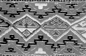 润方言的图案主要以人形纹、鸽子纹、龙纹为主,不仅追求形的酷似,而且色调和谐,对比鲜明,线条清晰,人们在欣赏时会产生美的联想。龙纹图案在润方言黎锦上用得较多。