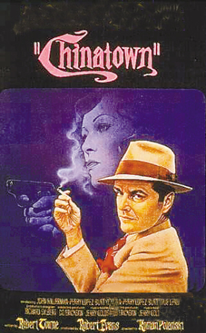 1974年,波兰斯基回到了美国,导演了电影《唐人街》,这也被视为70年代美国黑色电影最重要的一部电影。这部具有怀旧风格的侦探片有着复杂的情节和庞杂的人物线索,简单地说,故事发生在1937年的洛杉矶,一个私家侦探受雇去调查一起婚外情事件,在调查过程中却逐步揭开了一个有关谋杀、政客阴谋、乱伦等秘密的惊天内幕,《唐人街》秉承着波兰斯基一贯的黑色阴郁的风格,而且编剧、导演、表演、摄影、配乐等方面都达到了极高的水准,荣获了当年金球奖的最佳剧情片。其实《唐人街》的故事并不是发生在唐人街的,只是主人公杰克在从事侦探之前是在唐人街作警察的,唐人街只是影片中的一个巨大的隐喻,30年代的唐人街是个法律和道德缺位的三不管地带,罪恶丛生,人情冷漠,这也成为笼罩在杰克身上的一个挥之不去的阴霾,即使他远离了那个是非之地,最后却发现即使是有着“阳光之城”美誉的洛杉矶,也有着和唐人街一样的罪恶本质,片中有一句意味深长的台词可以与影片的绝望主题相对应:“你以为你知道唐人街的事情?别傻了。”