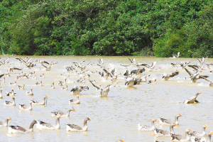 记者在基地采访时看到,这些灰天鹅体型肥大,生性好动,在湖面上黑压压一片,颇为壮观。工作人员告诉记者,为了便于养殖,这些天鹅的翅膀从小就已经过处理,否则是能一飞冲天的。