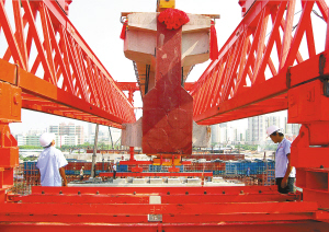 海南东环铁路海口东站目前已完成工程总量的百分之八十。图为十月十七日东环铁路海口东站站台T型梁在加紧架设中。 本报记者 古月 通讯员 王梅玉 摄