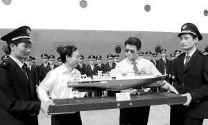 10月18日,武昌船舶重工有限公司的代表范万春(前左二)向广州海洋地质调查局局长马申达(前左三)移交船模。