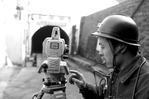 10月18日,救援人员在测量煤矿巷道。 10月17日凌晨1时许,陕西神木县永兴高庄煤矿601工作面发生冒顶事故,当班人员27人,安全升井24人,3人被困井下,目前抢险工作仍在紧张进行。高庄煤矿位于神木县永兴办事处高庄村,是一户证照齐全的合法民营煤矿。 新华社记者 陈钢 摄