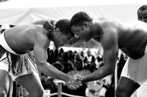 10月17日,在尼日利亚的尼日尔州首府明纳举办的尼日利亚第23届文化艺术节上,选手参加传统摔跤比赛。新华社/尼通社
