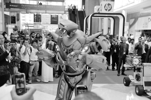 10月18日,在阿联酋迪拜世界贸易中心举行的2009GITEX海湾信息和通讯技术周上,人们观看一款能说话会唱歌的遥控机器人。2009GITEX海湾信息和通讯技术周当日在迪拜拉开帷幕,吸引了来自全球68个国家和地区的3000多家信息和通讯专业厂商参展。 新华社发
