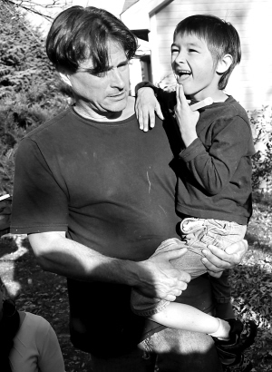 | 10月15日,在美国科罗拉多州柯林斯堡,希内在家门外抱着6岁的儿子法尔科内。 新华社/路透 |