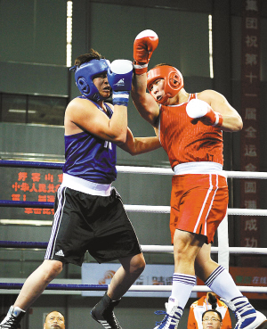 | 10月19日,黑龙江队选手刘涛(右)与内蒙古队选手高军在91公斤以上级预赛中。最终,高军以7:0战胜刘涛。 本报特派记者 宋国强 摄 |