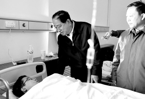 | 10月20日,内蒙古自治区政法委书记邢云在呼和浩特市和林格尔医院看望受伤民警孙延军。 新华社记者 任军川 摄 |