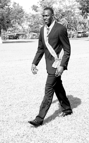 20日,在牙买加金斯顿举行的年度授勋典礼上,年仅23岁的博尔特成为牙买加第四级国家荣誉最年轻的获得者。 新华社发
