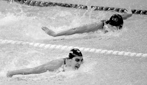 20日,在男子200米蝶泳决赛中,来自浙江队的吴鹏(下)以1分54秒40的成绩为自己夺得本届全运会第一枚金牌。 本报特派记者 宋国强 摄