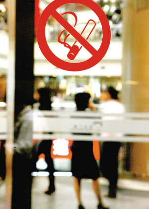 10月22日,上海市浦东新区陆家嘴一家大型商厦门前张贴着醒目的禁止吸烟标志。 10月21日,提请上海市十三届人大常委会第十四次会议审议的《上海市公共场所控制吸烟条例(草案)》进一步扩大了禁烟范围,将音乐厅、公共电梯内、网吧列入禁烟场所。修改后的条例草案还新增了政府机关的会议室、餐厅以及共用的工作场所等室内公共活动区域禁止吸烟的规定。 新华社记者 陈飞 摄