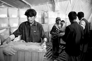 | 十月二十二日,工作人员在阿富汗首都喀布尔往卡车上装投票箱。 新华社/法新 |