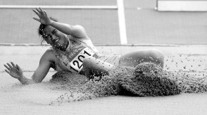 22日,我省田径小将王慧琼在女子七项全能跳远比赛中。最终,她获得该项目第9名。 本报特派记者 宋国强 摄