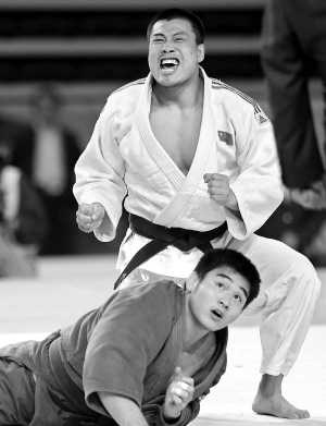 22日,在柔道男子100公斤级决赛中,邵宁战胜上海队选手姬仲夏夺得冠军。图为山东队选手邵宁(上)庆祝胜利。 新华社发