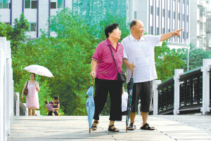 | 10月21日,候鸟老人在三亚河洁净的步行桥上喜观三亚新貌。