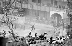 当地时间25日约10时30分,巴格达省政府大楼和曼苏尔饭店大门前首先遭到自杀式汽车炸弹袭击,十余辆汽车被炸毁,现场火光冲天。约10秒钟后,又一声巨大的爆炸声响起,在同一条街道上的伊拉克司法部大楼也遭到自杀式汽车炸弹袭击。