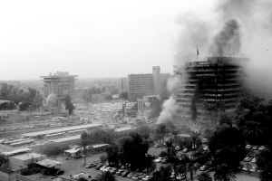 | 巴格达的司法部大楼附近浓烟滚滚。