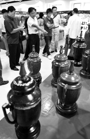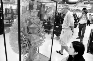 除了黄花梨家具,海南黄花梨根雕也很受关注。这些根雕造型古朴,追求原汁原味,精雕细刻的《九龙戏珠》、《百鸟朝凤》成为本次展会的亮点。由此可见,人们审美诉求已经悄然改变,传统工艺披上时尚的外衣,更能赢得消费者的喜爱。