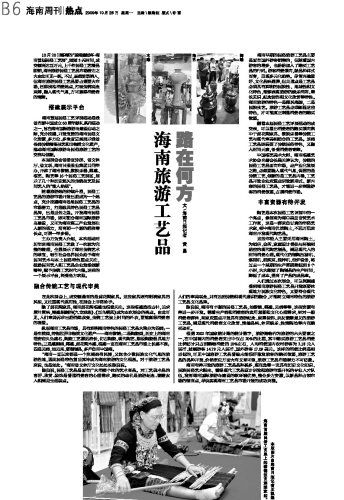 “海南一直以来都是一个充满热带风情,又饱含少数民族文化气息的旅游胜地,因此民俗特色首当其冲成为海南旅游的文化根基。对于旅游工艺品来说,也是如此。”海南省文体厅文化处处长陈良说。