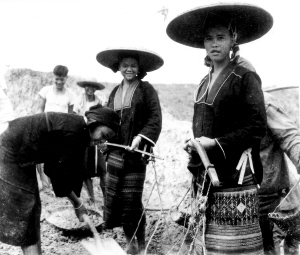 | ↑石碌水库工地,七差公社黎族社员挑土。