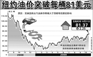 | 当地时间10月21日,纽约油价突破81美元,创下一年来盘中新高。专家预计,如果一周内国际油价稳居在75美元/桶之上,下月初国内汽柴油零售价将面临上调。 |