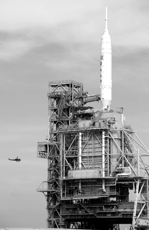 10月25日,在美国佛罗里达州肯尼迪航天中心,“战神I-X”运载火箭坐落在发射台上。美国国家航空航天局定于27日首次试射“战神I-X”运载火箭。西方媒体评价,此次试射承载着美国人重返月球乃至首登火星的希望。 新华社/路透