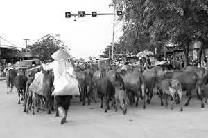 | ← 日前,在东方市八所的一条干净整洁的主要街道上,一群牛正在红绿灯前悠闲过马路。