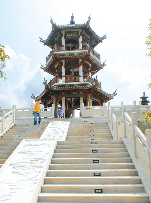 10月26日,重阳佳节,号称“南海第一楼”、“中国最南端楼阁”的沧海楼在亚龙湾畔最高峰红霞岭顶落成。 沧海楼是亚龙湾热带天堂森林公园一处标志性建筑,楼高16.39米,分三层,基座高4.8米,运用了起脊、飞檐、雕梁、垂花、宝顶、瓦当、瑞兽、汉白玉浮雕、铸铜祥云莲花灯柱等构件与建筑手法,带有浓郁的中国传统古建筑风格。 登楼远眺,亚龙湾、海棠湾、榆林湾、三亚湾、红塘湾及周边小岛尽收眼底。 本报记者 苏建强 摄影报道