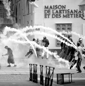 在法国马赛,球迷躲避警察发射的催泪弹。因为巴黎圣日耳曼队中有球员感染了甲型H1N1流感,10月25日,马赛队主场迎战巴黎圣日耳曼队的比赛被临时推迟。由于推迟比赛的通知宣布太晚,无处发泄怒气的两队球迷大打出手,造成十余人受伤。 新华社/法新