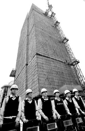 10月27日,城管队员在违建楼下维持秩序。 当日,执法人员对汉口汉江北路的一座楼房的违建楼层进行强行拆除。据悉,这栋楼房获批修建12层,但开发单位却不顾监管方警告,目前已将楼房违章建设至20层。 新华社发