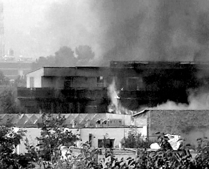 | 阿富汗首都喀布尔市中心联合国一家招待所遇袭后燃起熊熊大火。 新华社/路透 |