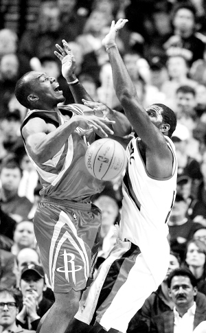 28日,在NBA常规赛中,火箭队客场以87:96负于开拓者队。图为火箭队兰德里(左)在比赛中被开拓者队奥登封盖。 新华社发
