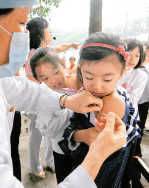 10月28日,医务人员在为广西柳州市景行小学的学生注射甲型H1N1流感疫苗。 新华社发