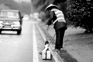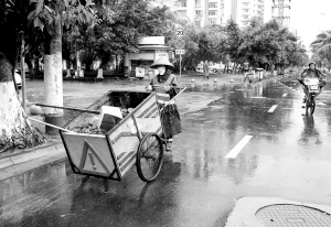 9月23日,海口市龙昆南路,环卫工人冒雨作业。 本报记者 张杰 摄