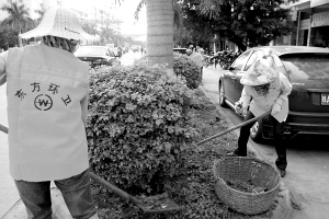 10月19日,东方市环卫工人在清理绿化带里残留的垃圾。