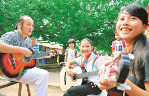 今天上午,由共青团海口市委和海口市青少年宫共同组织的海口市占符村青少年宫流动教学点挂牌仪式暨开学典礼,在海口市龙华区龙泉镇占符小学举行。 据悉,该流动青少年宫将通过快乐游戏、快乐体验、快乐读书等系列活动,让更多的农村孩子共享优质的校外教育资源。图为占符小学的同学们在向海口市青少年宫的老师学吉他。 本报记者 张杰 摄