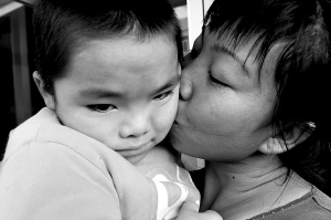 在贵阳市儿童福利院,来自贵州省黔西县的曾祥鲜亲吻丢失半年多的儿子。(见图①)。