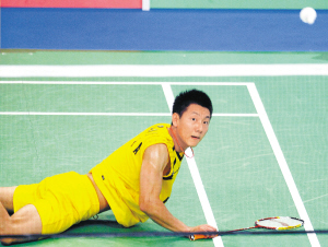 | 30日,在2009年巴黎羽毛球公开赛男子单打比赛中,中国选手陈金以2:0战胜荷兰选手迪基。图为陈金在比赛中救球。 新华社发 |