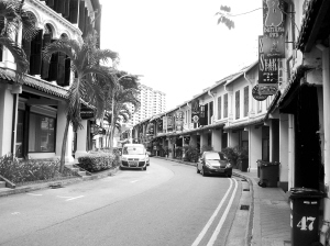 新加坡河南面,就是我们慕名而去的牛车水(Chinatown)。它的面积和海口老城区大致相同,其建筑风格也与海口老街很接近,多为二至三层的南洋骑楼建筑。分为牛车路、直落亚逸街、丹戎巴葛和武吉巴梳路四个不同风格的小区和十几条街道,并且街道有主次之分相当于坊巷;临街的骑楼作为商铺有各种风味的咖啡厅、美食小站,外观颜色丰富,鲜艳夺目;内街平行于商业街的小巷作为运输、居住和仓储,其中丁加奴街、史密斯街则是牛车水的主要活动中心。
