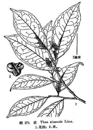 “茶,常绿灌木,高至4米;小枝无毛。叶椭圆状披针形至倒卵状披针形,长5-10厘米,顶端急尖或钝,有浅齿,背面幼时有毛,最后无毛。花白色,芳香,直径2.5厘米;子房3室,有长毛。蒴果直径12-18毫米;种子1-3颗,近球形,微有棱角,直径约1.8厘米,浅褐色。花期:10-12月。产地:保亭、琼中。生于山坡、山顶疏林中或阳坡。本种通常栽培,但在海南有野生。叶供制茶叶用。”