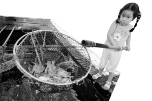 小朋友在陵水海上渔排捞螃蟹。 本版图片由海南日报记者王凯、李幸璜摄