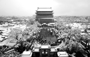 这是11月1日拍摄的北京鼓楼附近雪景。 当日,受寒潮影响,一场瑞雪降落京城。记者从北京市气象台了解到,目前,北京正处于由深秋向初冬过渡时期,这次强劲的寒潮让北京今冬初雪比去年提前了2个月,但寒潮过后,气温将开始回升至正常值数。此外,京城的这场“深秋”降雪之所以越来越大,除了寒潮影响外,也有人工干预的原因。 新华社发