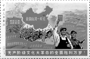 “全国山河一片红”在1968年文化大革命期间发行,北京邮票厂印制,面值8分。小幅邮票图案为工农兵手持《毛主席语录》,背景中“革命委员会”的红旗以及工农兵群众热烈欢呼的场面汇成红色海洋,画面上方为一幅中国地图,地图上除台湾外全部绘成大红色,并印有“全国山河一片红”金字;大幅的“全国山河一片红”尺幅为普通邮票的2倍,画面内容与小幅的相似,下书“无产阶级文化大革命的全面胜利万岁!”。
