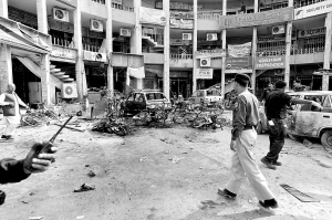 | 警察在拉瓦尔品第市的爆炸现场外警戒。新华社/法新
