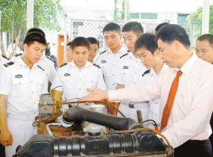 11月2日上午,南航部队司令部60余名即将退伍的老兵来到共建单位———海口市金盘职业学校,参加该校免费为部队官兵举办的军地两用人才培训。培训内容有计算机网络应用与维修、汽车应用与维修、烹饪等项目。 图为老师在为老兵们讲解汽车发动机构造原理。通讯员 邢利民 冯煜 摄影报道