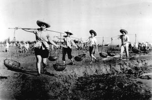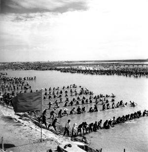 涨潮时,人们毫无怨言地泡在齐腰深的海水里,排成一列一列的队伍,一次一次传递着退潮时他们从海中捞起的一筐筐淤泥;堤坝上密密麻麻,人们三两人一组,用手推车推土。