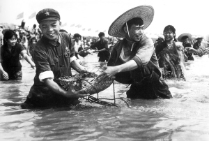 蔡自强摄的另一张老照片,是当时海口市委书记张发华泡在海水中与海口市八一手扶拖拉机厂的工人们一起参加劳动的情景。