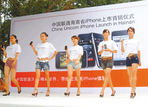 本报讯 中国联通iPhone手机11月1日在海南上市(见上图,广文摄)。iPhone 3GS是迄今速度最快、功能最强大的苹果手机,具有两倍于iPhone 3G的运行速度。上市两天来,倍受消费者青睐。