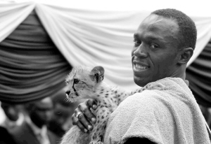 11月2日,牙买加“飞人”博尔特在肯尼亚野生动物中心收养了一只3个月大的小猎豹,取名为“闪电博尔特”。图为博尔特怀抱小猎豹。 新华社发