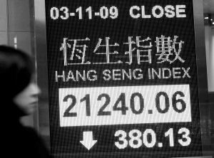11月3日,市民从香港湾仔一家银行的恒生指数电子显示屏前走过。当日,香港恒生指数下跌380.13点,收报21240.06点,跌幅1.76%。 新华社发