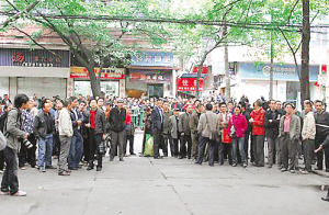 法庭外等待审判结果的群众。